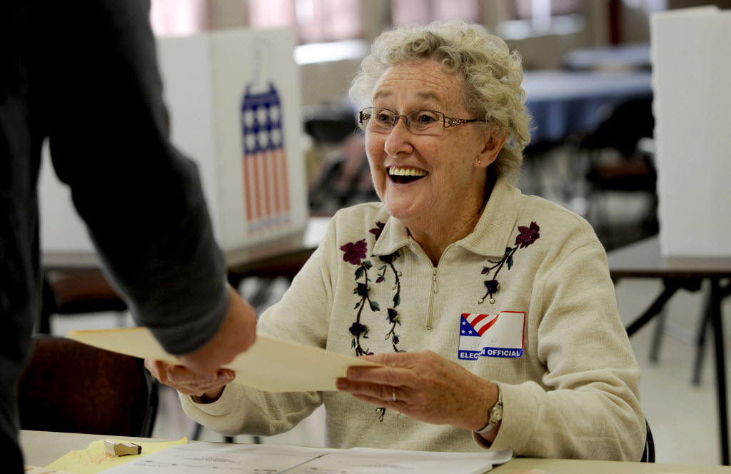 Election official Arvella Layson handed out ballots at St.Thomas Center in Coeur d’Alene today. You can read about turnout at the various precincts here and here. (SR photo: Kathy Plonka)