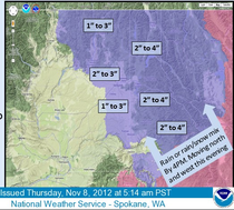 Northwest tonight and could continue through Friday afternoon. The National Weather Service issued an advisory this morning that up to three inches of snow is expected in the Spokane area and its surrounding region and up to four inches in the mountain areas of North Idaho. The expected cold front will bring lows in the 30s this evening with northeast winds of about 10-15 mph chilling the temperature near the 20s overnight. Gusts of about 25 mph are expected as well, but mainly near the Coeur d’Alene area/