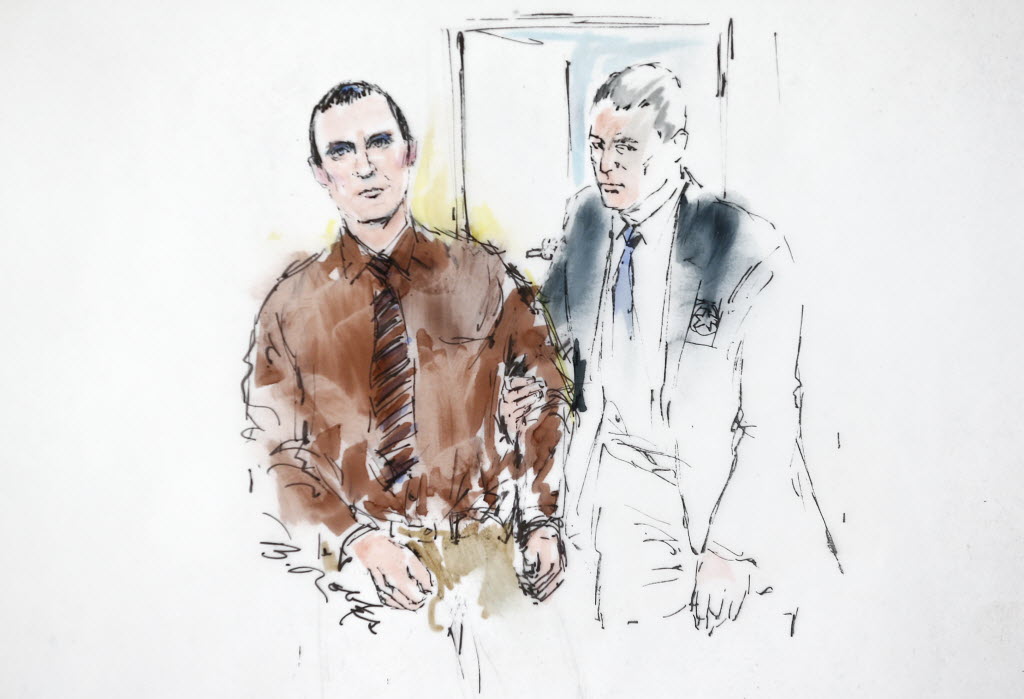 In this courtroom sketch, Jared Loughner is lead into the courtroom by a U.S. Marshal prior to sentencing in U.S. District Court earlier today in Tucson, Ariz. U.S. District Judge Larry Burns sentenced Loughner, 24, to life in prison, for the January 2011 attack that left six people dead and Giffords and others wounded. Loughner pleaded guilty to federal charges under an agreement that guarantees he will spend the rest of his life in prison without the possibility of parole. (AP Photo/Bill Robles)