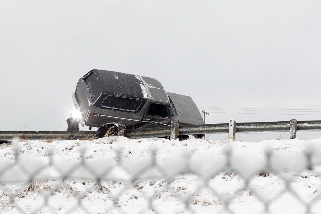 On Friday, a trooper with the Idaho State Police takes a photograph of an SUV that spun out of control and ended up on the guard rail near mile post 11 on Interstate 90 in Coeur d’Alene. Dozens of accidents were attributed to wintry conditions. (AP Photo/Coeur d’Alene Press, Shawn Gust)