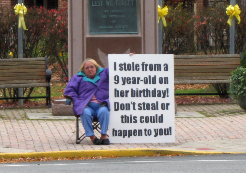 Evelyn Border holds a sign in front of the Bedford County courthouse in Bedford, Pa. Bedford County District Attorney Bill Higgins says in exchange for Border and her daughter, Tina Griekspoor, both of Bedford, agreeing to hold the signs, he’ll asked for probation instead of jail when they plead guilty. Higgins says they swiped a gift card which a girl set on a shelf while a WalMart employee helped her. You write the cutline. (AP Photo/Bedford County District Attorney’s Office, File)