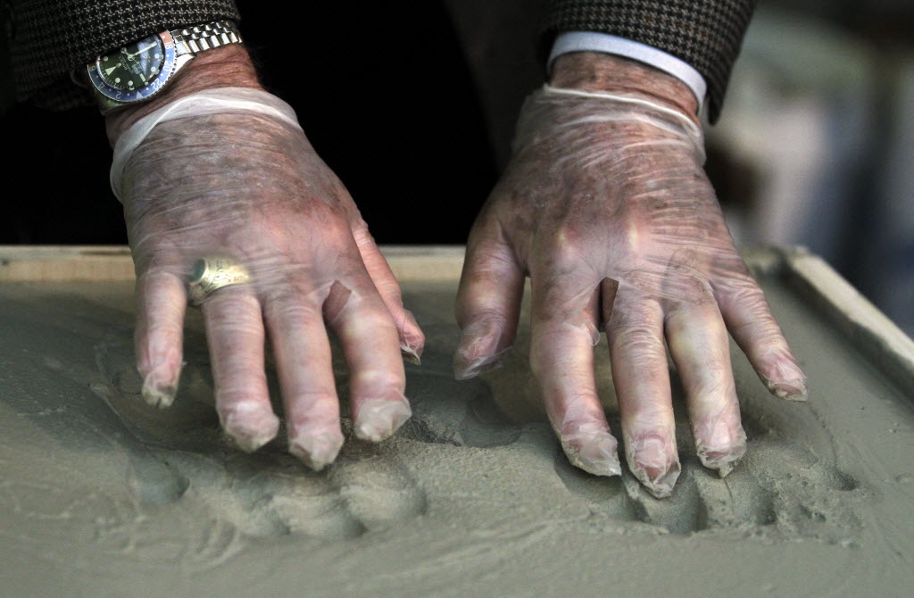 Apollo 17 astronaut James Lovell lifts his hands out of the wet concrete during a media event at Adler Planetarium earlier today in Chicago. Lovell’s hand and foot prints, as well as those of Apollo 17 astronauts Eugene Cernan and Harrison Schmitt, will be displayed in an upcoming exhibit to celebrate 40th anniversary of the Apollo 17 mission, the 11th and final manned flight to the Moon for NASA’s Apollo program. (AP Photo/Kiichiro Sato)