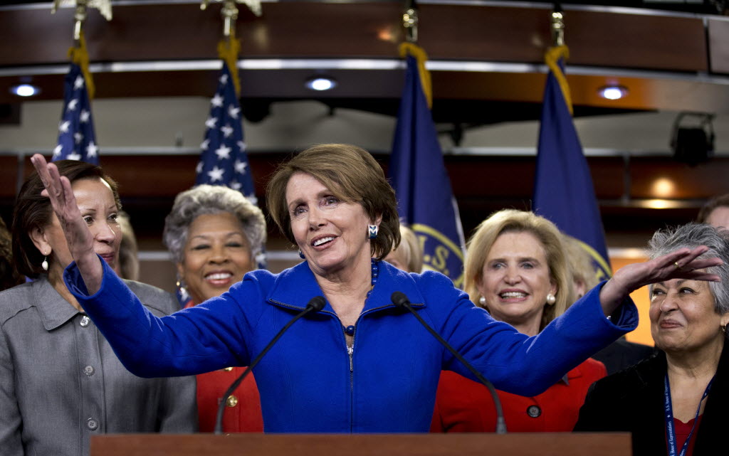 House Minority Leader Nancy Pelosi of Calif., accompanied by women House Democrats, gestures during a news conference on Capitol Hill in Washington, Wednesday, Nov. 14, 2012, where she announced that she wants to remain as the top Democrat in the House of Representatives. From left are, Rep. Nydia Velazquez, D-N.Y., Rep.-elect Joyce Beatty, D-Ohio, Pelosi, Rep. Carolyn Maloney, D-N.Y., and Rep.-elect Gloria Negrete McLeod, D-Calif. (AP Photo/J. Scott Applewhite)