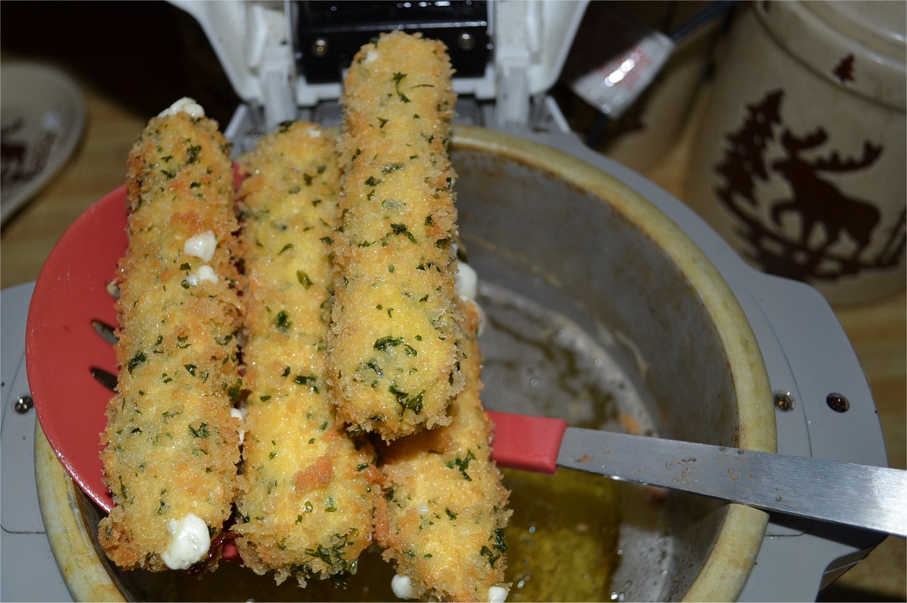 “I should rename this blog to ‘Stebbijo’s Deep Fat Frying Madness or My Deep Fat Fryer and Me,’” posts Stebbijo/Stebbijo’s Place.” I swear if I could not cook with a deep fat fryer, I would just shrivel up to nothing! Now, that is a thought. I call these ‘cheezies’ but other folks know them as mozzarella sticks.” More here.