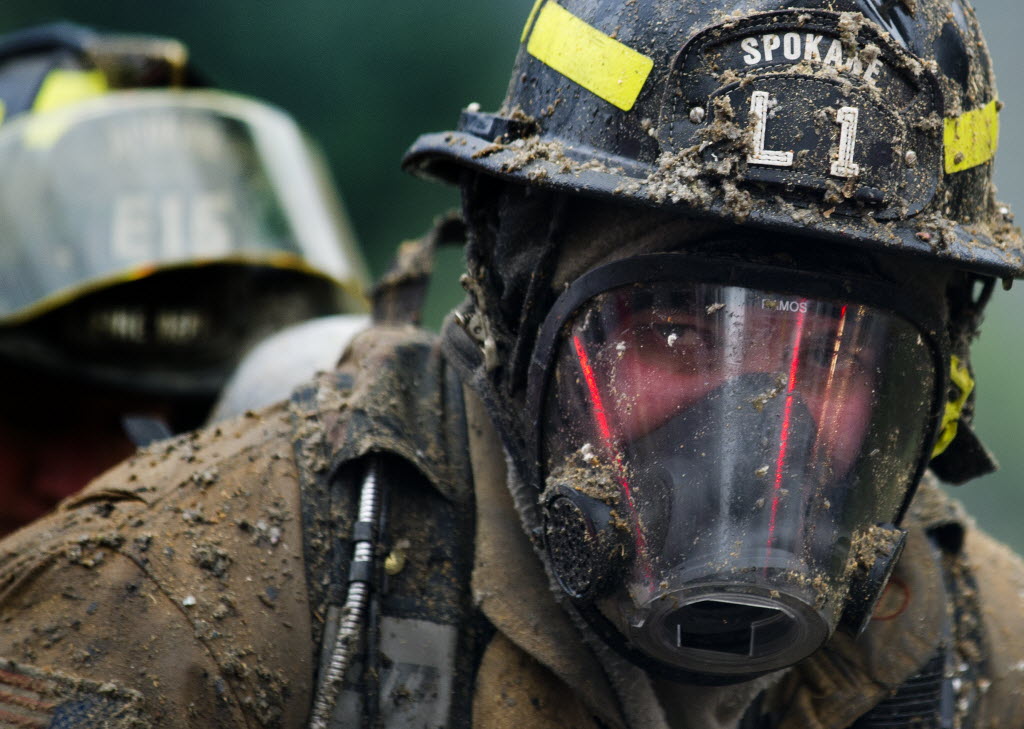 A Spokane firefighter emerges from an apartment complex covered in ash and dust a fire at East Mission Ave and 1600 North Cincinnati Street on Tuesday Spokane. (SR photo: Tyler Tjomsland)