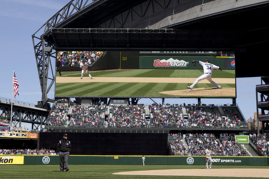 In this computer rendering provided by the Seattle Mariners, a new high definition video display screen is seen where it will replace the current center field scoreboard at the team’s ballpark in Seattle. The Mariners announced today that they will install the largest scoreboard video screen in all of Major League Baseball at their ballpark during the offseason. The new display will replace the old scoreboard that was part video screen and part advertising. The latest configuration will be entirely a video screen, and will stretch the entire width of the center field bleachers where the current scoreboard is mounted. The Mariners say that at 201.5 feet wide and 56.7 feet tall, the video board will be 10 times the size of the current video screen when it’s installed before the 2013 season. (AP Photo/Seattle Mariners, Ben VanHouten)