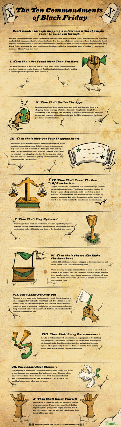 But since that’s not everyone’s choice, we’ll offer up an infographic produced by Mint that alleges to be the Commandments of Black Friday.