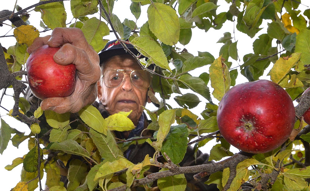Milton Finster, 94 works to harvest the 250-300 pounds of Ida Red apples from his backyard tree in the Lewiston Orchards recently with the help of his wife June. “This is the only Ida Red apple tree in the Valley that we know of, said Finster, who owned and operated Finsters Orchard in Lewiston before his retirement. The pair plan to make apple sauce, pies and juice with their backyard harvest. (AP photo/ Lewiston Tribune, Steve Hanks)