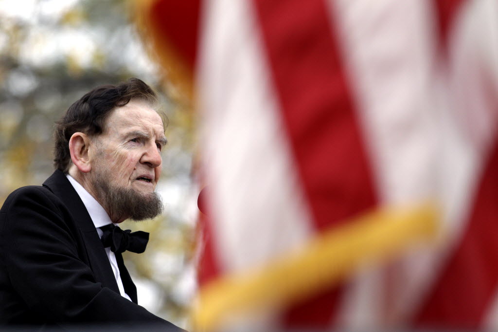 Jim Getty, portraying President Abraham Lincoln, delivers his rendition of the Gettysburg Address during a ceremony to mark the 149th anniversary of Lincoln’s speech at Soldier’s National Cemetery in Gettysburg, Pa., Monday. Director Steven Spielberg and historian Doris Kearns Goodwin were also on hand to deliver remarks and participate in a wreath-laying ceremony. (AP Photo/Patrick Semansky)