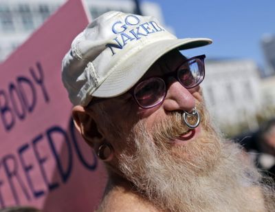 Woody Miller attends a rally in opposition to a city-wide nudity ban outside of City Hall in San Francisco, Wednesday. San Francisco appears poised to shed part of its image as a city where anything goes, including clothing. The Board of Supervisors is scheduled to vote next week on a law that would ban public nudity. The proposal comes in response to a devoted group of nudists who proudly strut their stuff through the city’s Castro District. (AP Photo/Marcio Jose Sanchez)