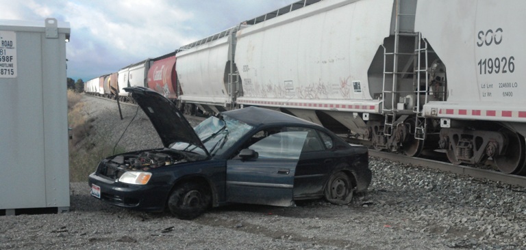 SR photographer Kathy Plonka snapped this photo of a vehicle that was hit by a train this morning at the railroad crossing north of Chase & Poleline on Rathdrum Prairie. No further information was available.