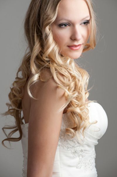 But regardless of the season or venue, unless your hair is very naturally curly, any hair worn down or mostly down will “fall” (i.e. get a little limp) to some extent as the night progresses and you hit the dance floor, warns Gina Ludwig, owner of HairComesTheBride.com, which employs hair stylists across the country and sells coiffure accessories. “Therefore,” says Ludwig, “these styles are best on a bride who has some natural texture to her hair, whose hair will hold a curl fairly well, and whose hair is not too fine or thin.” Ask for hair extensions if you need a little extra volume or length, Soleimani adds.