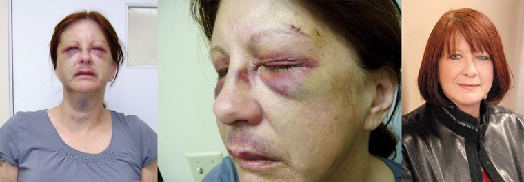The photos on the left show Carol Williams the night of her beating. The photo at the right was taken this week. Zane Tewalt will be sentenced Friday for the attack on the St. Maries woman. (Courtesy: St. Maries Gazette Record)