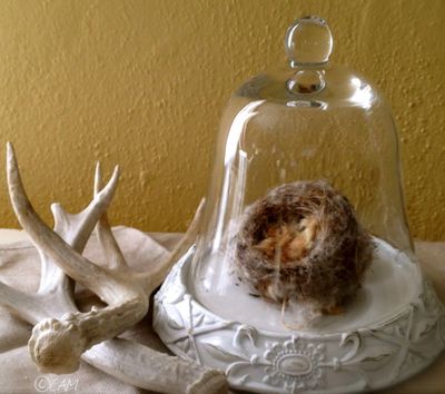 before, to protect it and, although it hadn’t occurred to me when I bought it, I realized the flat candle holder was the perfect base, just the right size to hold the glass bell over the fragile nest.