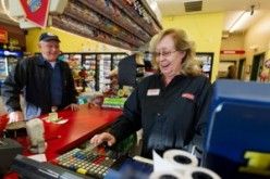 (Shawn Gust Coeur d’Alene Press photo: Vera Gilpatrick, cashier at Fairway Gas and Grocery, rings a Powerball ticket sale into her register)