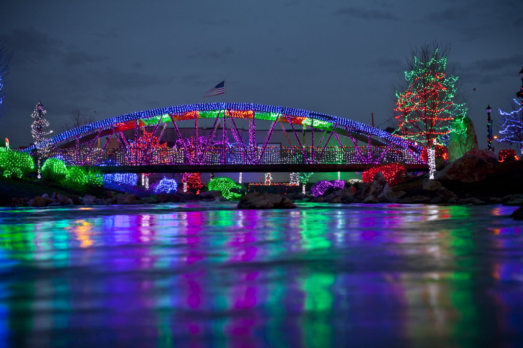 Holiday lights are reflected off Indian Creek in Caldwell on Wednesday. More than 500,000 lights are part of the annual display. The city of Caldwell will host it’s annual Treasure Valley Night Light Parade this coming Saturday. (AP/Statesman photo: Chris Butler )