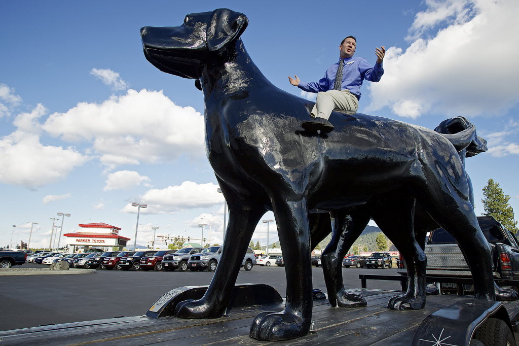 After prodding from his coworkers at Parker Toyota, Chris Baker sits atop a 9-1/2-tall fiberglass dog sculpted to the likeness one of the car dealership’s mascots “Lucky” which was delivered to the Coeur d’Alene car lot Wednesday from Wisconsin. (AP Photo/Coeur d’Alene Press, Jerome A. Pollos)