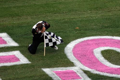 Kligerman restarted 21st, but before the field completed two laps, the driver of the No. 7 Tundra had pushed the No. 23 Ford of Jason White from 18th to the lead. White and Kligerman were running 1-2 when Hornaday spun again in the tri-oval, his right-rear tire shredded.
