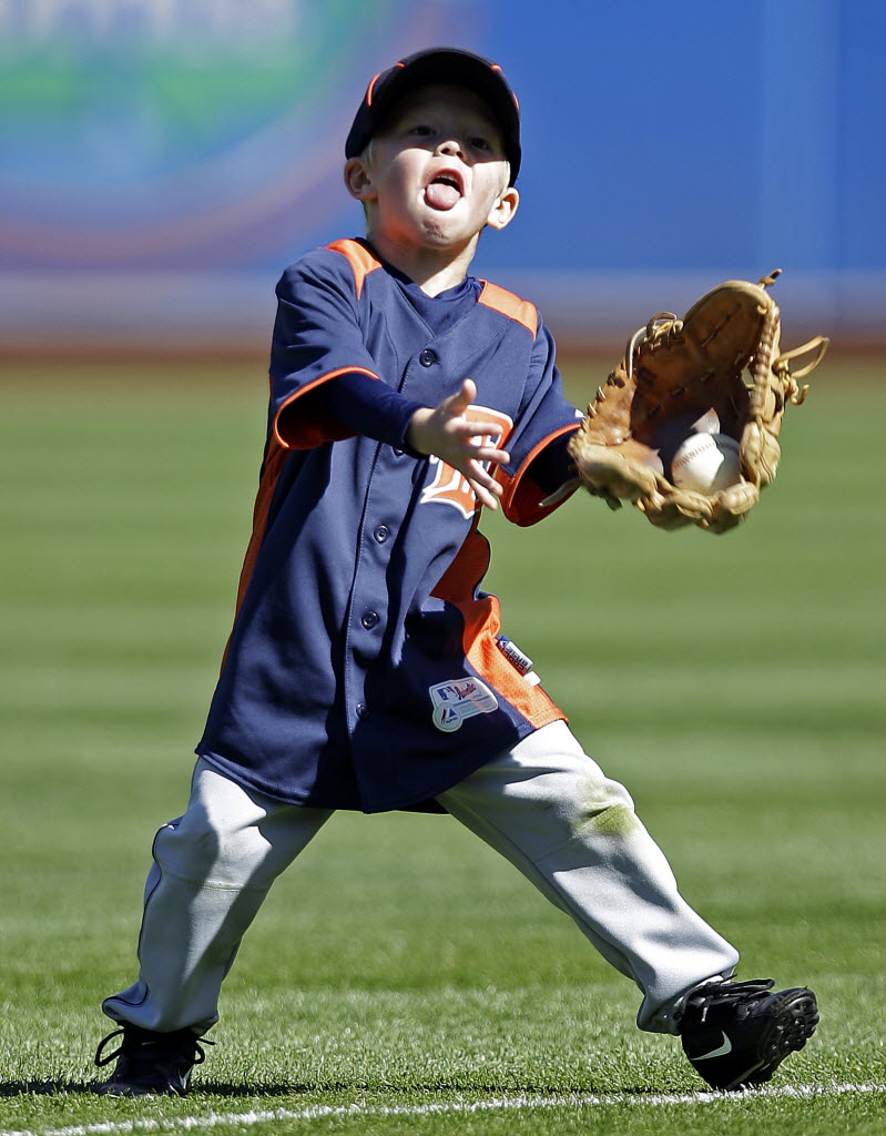 Gage Brookens, 5, grandson of Detroit Tigers’ first base coach Tom Brookens, fields a ball during batting practice in preparation for Game 3 of the American League division baseball series against the Oakland Athletics on Monday in Oakland, Calif. (AP Photo/Ben Margot)