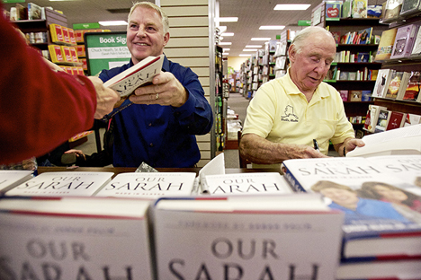 Karen White had one reason for being among the first in line Monday night to listen to Sarah Palin’s father and brother pitch their book, “Our Sarah: Made in Alaska.” “Because I like Sarah Palin,” the Coeur d’Alene woman said, holding two copies of the $24.99 hardback written by Chuck Heath Sr. and Chuck Heath Jr. White bought one for herself and one for a friend, and had both autographed by Sarah’s dad and brother. “They’re down-to-earth people,” she said. About 50 folks gathered at the Hastings store on Best Avenue to hear from the Heaths during one of their stops on a nationwide book tour. The Chucks chatted for 45 minutes about faith, politics, the media and Sarah, of course - but not too much - because they’ve got a book to sell and sign that offers “intimate stories from Sarah’s life along with a celebration of growing up in and sharing all that Alaska means to Sarah and her family”/ Bill Buley , Coeur d’Alene Press. More here.