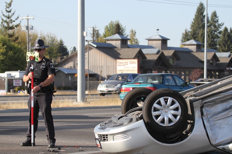 Another Duane Rasmussen photograph for Huckleberries Online of spectacular crash that tied up traffic for awhile at intersection of Highway 95 & Hayden Avenue. You can see Woody McEvers’ Ruster’s Roost in the background. One woman was taken to Kootenai Medical Center.