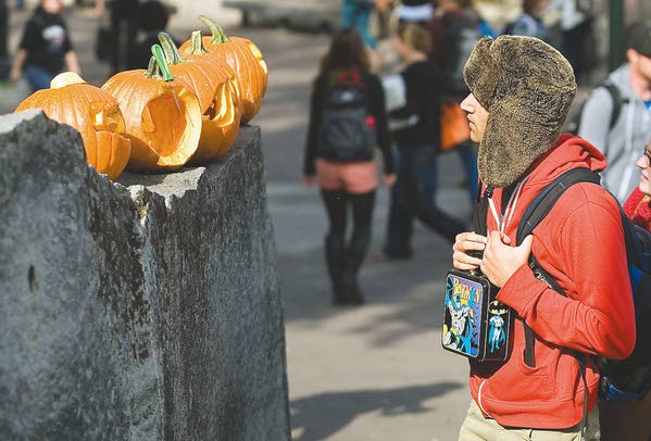 Washington State University freshman Joseph Olsen stops between classes to look at jack-o-lanterns outside Todd Hall in Pullman on Monday. (Moscow Pullman Daily News photo: Geoff Crimmins)