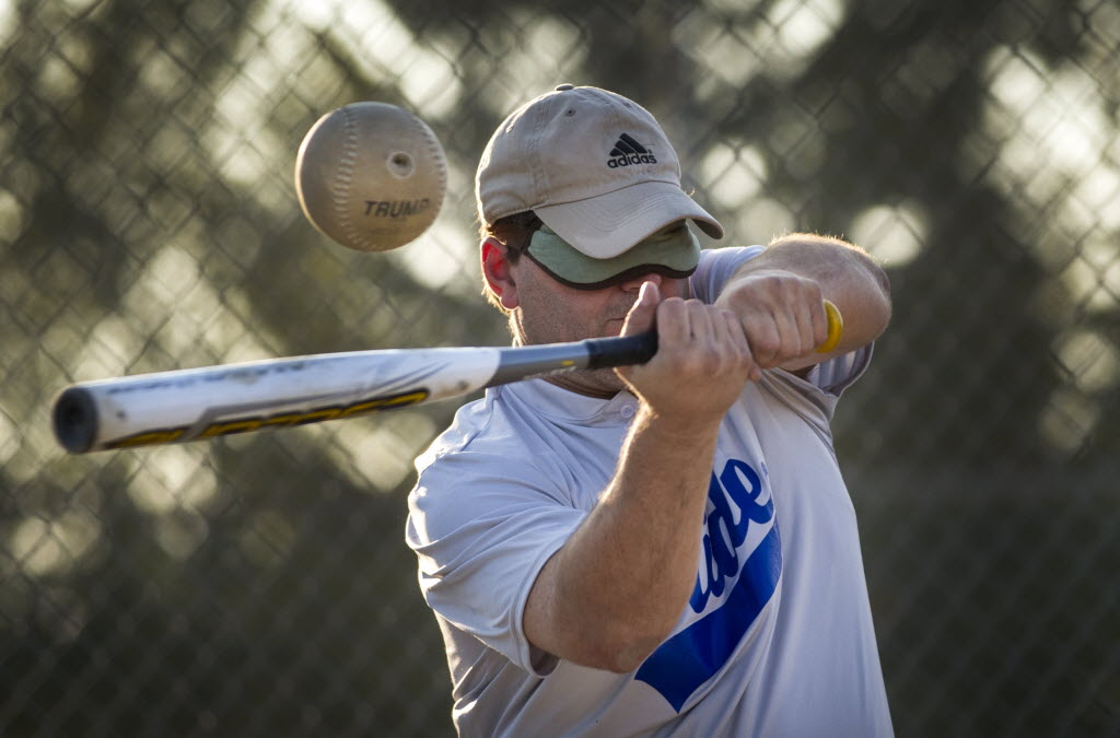 At a Spokane Pride beep baseball scrimmage, team captain and coach Troy Leeberg, takes a swing at a softball that makes noise Thrusday at Franklin Park. Beep baseball is an adaptive version of baseball for the blind and visualy impaired. (SR photo: Colin Mulvany)