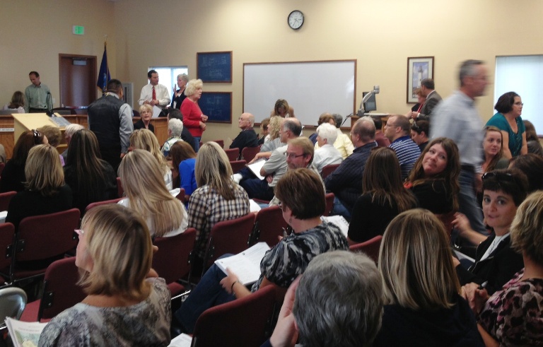 It appears as thought the Coeur d’Alene School Board will attract an overflow crowd for its 5 o’clock meeting this afternoon at the Midtown Center. Huckleberries has learned 50 people already are in attendance, 40 minutes before the start of the meeting. (Above, view of room 25 minutes before start of meeting.) Most, I suppose, are there to testify or hear the discussion about the proposed end of the Primary Years Programme (an elementary school version of the International Baccalaureate program that the new School Board voted in August to phase out.