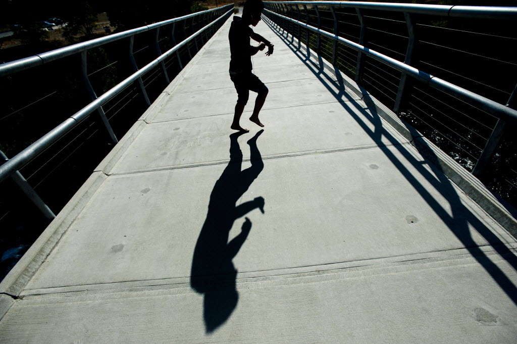 Miguel Perez, 20, of Spokane, dances earlier today on the Sandifur Memorial Bridge in Spokane, Wash. Perez said he regularly visits the bridge and dances to release negative energy. “I dance for tranquility and peace of mind,” he said. (AP Photo/The Spokesman-Review, Tyler Tjomsland)