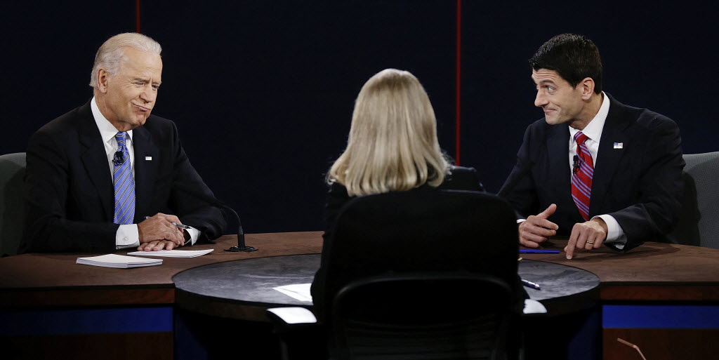 Vice President Joe Biden and Republican vice presidential nominee Rep. Paul Ryan, of Wisconsin, participate in the vice presidential debate at Centre College, Thursday, in Danville, Ky. (AP Photo/Charlie Neibergall)