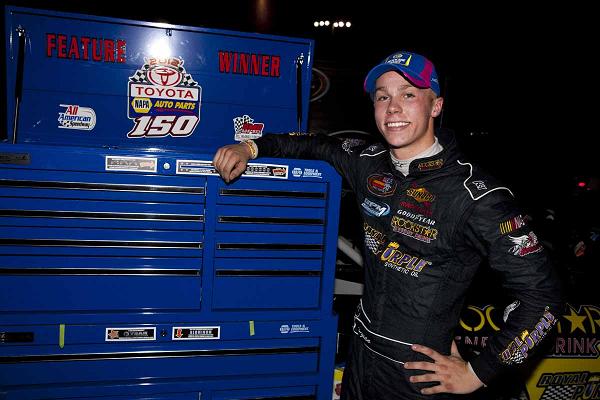 The 17-year-old from Las Vegas rebounded from an early flat tire to win the Toyota/NAPA Auto Parts 150 in NASCAR K&N Pro Series West action on Saturday night at All American Speedway and regain the lead in the championship standings, with just one race left on the schedule.
