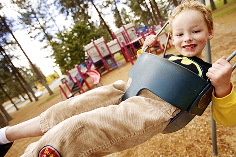 Keegan Day, 4, plays on one of the swings at White Park in Post Falls during a trip Monday to the park with his father. The Post Falls City Council is expected to approve a Parks & Recreation facilities master plan when it meets tonight, including a dog park, splash pad, community center and trail improvements. Story here. (Coeur d’Alene Press photo: Jerome A. Pollos)