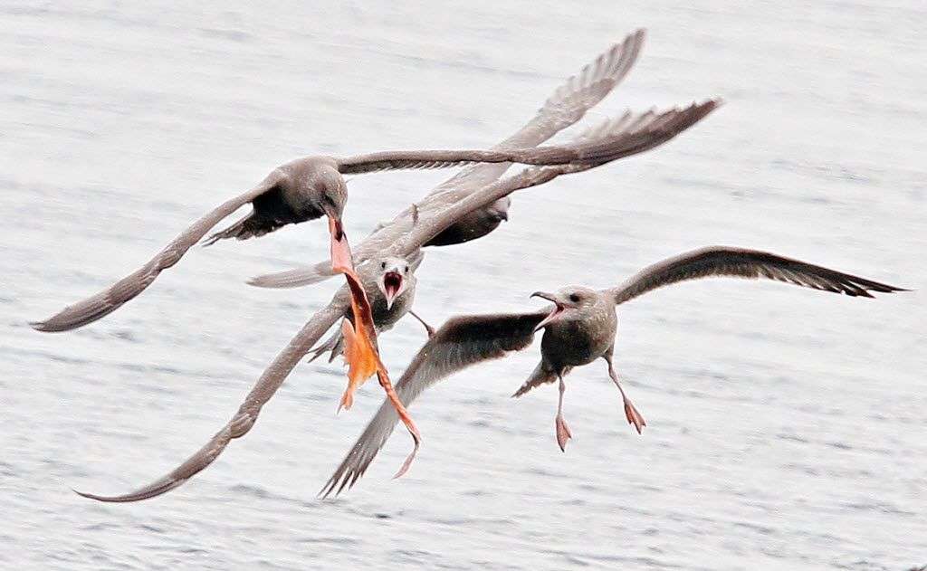 A gull flies away with a beak full of salmon meat on Monday as fishermen at the Vernita Boat Launch discarded pieces while filleting fish on the shore. (AP Photo/The Tri-City Herald, Kai-Huei Yau)