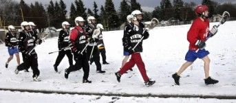 (SR file photo: A high school lacrosse team takes a lap around the track at Person Field in the snow)