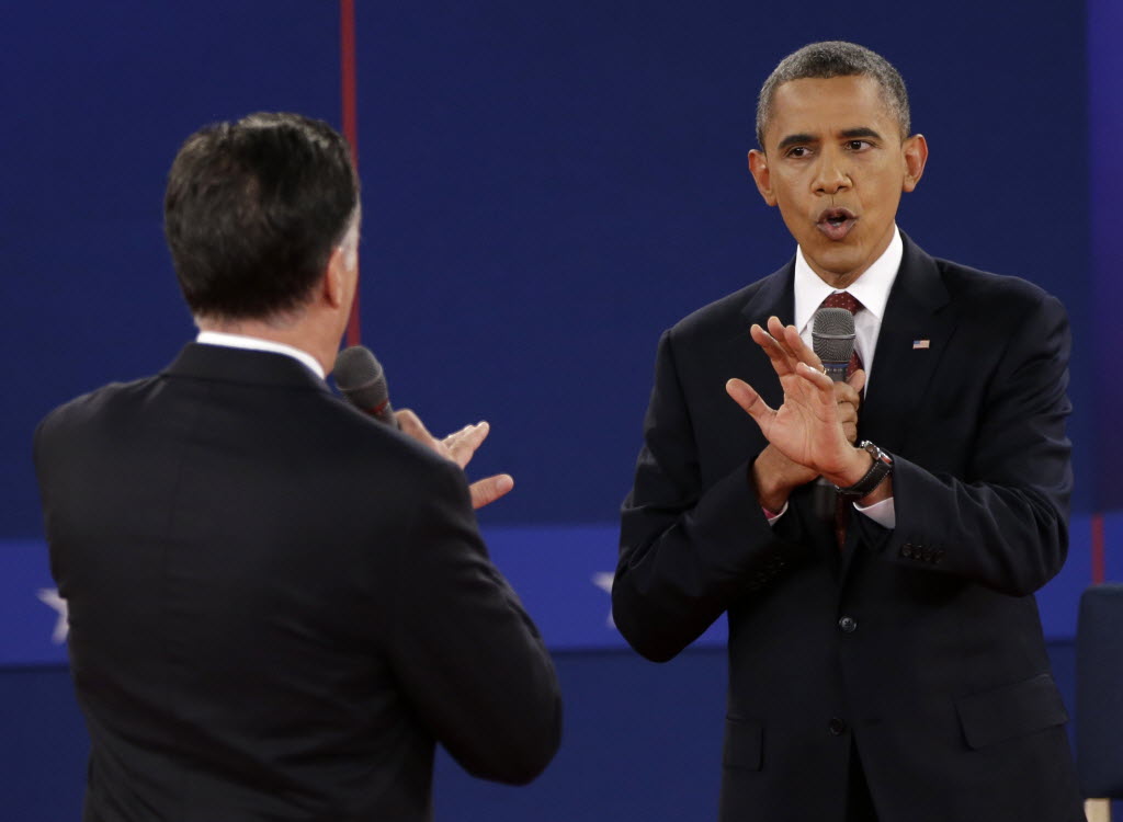 President Barack Obama and Republican presidential nominee Mitt Romney speak during the second presidential debate at Hofstra University, Tuesday, Oct. 16, 2012, in Hempstead, N.Y. New York Times story here. (AP Photo/David Goldman)