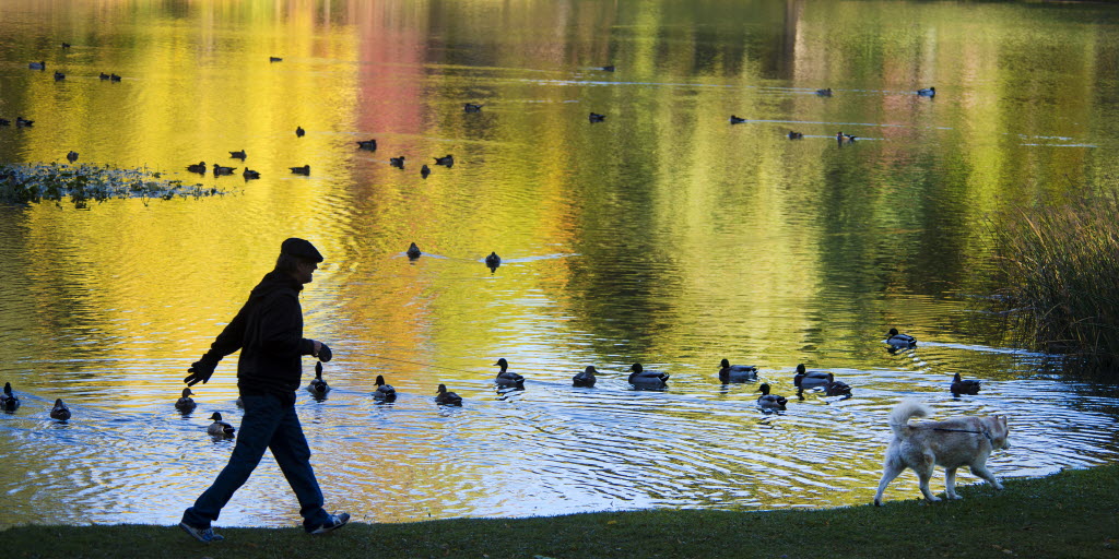 Dan Kunkel, 56, takes a morning walk around Cannon Hill Park pond with his dog, Marley, today in Spokane. The turning color of trees reflects off the water as ducks swim on the pond. (SR photo: Dan Pelle)