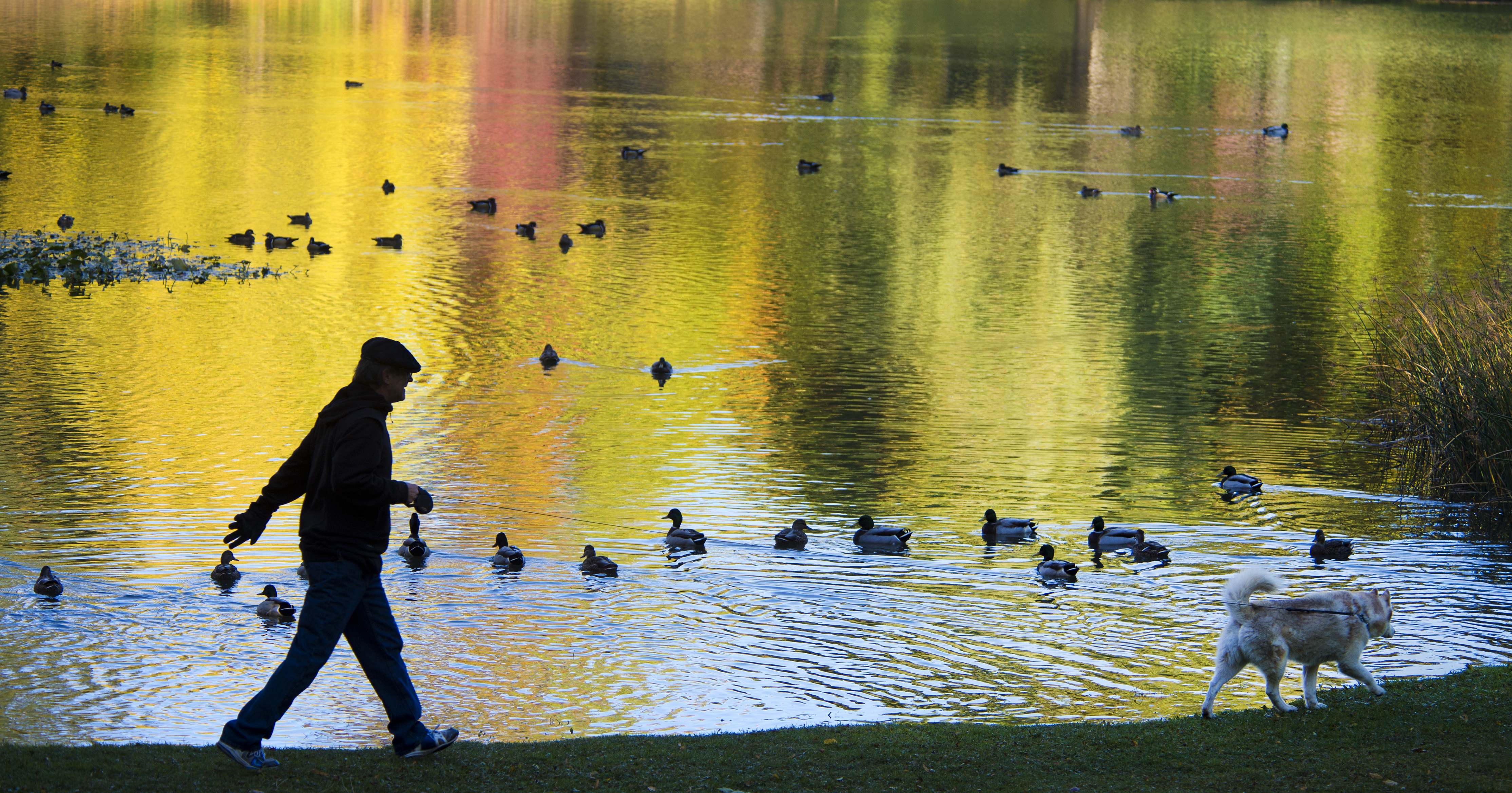 Dan Kunkel, 56, gets a morning walk around Cannon Hill Park pond with his dog Marley on Wednesday. The fall colors of surrounding trees reflect off the water. Said Kunkel about his dog, “She doesn’t waste too much time with the ducks.” On the Web: For a big-picture gallery of autumn scenes throughout the Inland Northwest, go to spokesman.com/picture-stories. Dan Pelle SR, photo