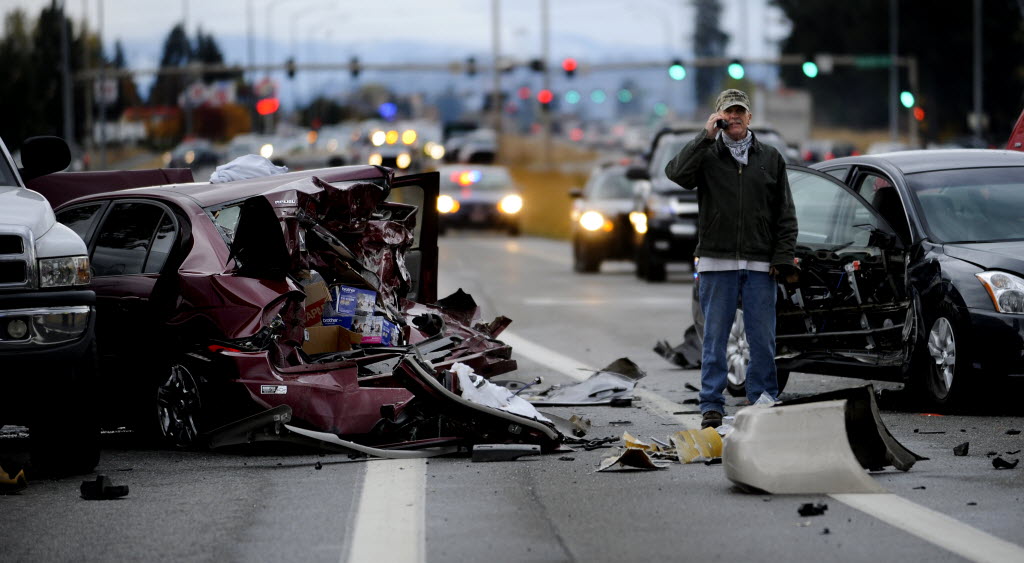 A motorist makes a phone call in the middle of a 13 car pile up on Highway 95 at Kathleen Avenue early Tuesday in Coeur d’Alene. The northbound lanes of Highway 95 are shut down and traffic is being detoured around the crash at Bosanko Road. The southbound lanes are open and not affected by the crash. Several people were injured in the crash, the extent of their injuries is not known. See more in drop-down box below. KHQ story here. (SR photo: Kathy Plonka)
