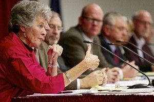 (NIC Trustee Judy Meyer gives a thumbs up during candidates’ forum Tuesday night)