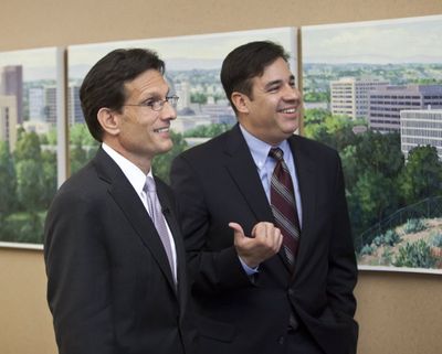 House Majority Leader Eric Cantor, R-Va., left, stands with Rep. Raul Labrador, R-Idaho speaks with reporters while in Boise Wednesday to help campaign Labrador. See story below. (AP photo: Idaho Statesman)