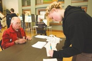 (Geoff Crimmins Daily News photo: Volunteer Dick Fredericks, left, helps Moscow High School sophomore Chloe Williams fill out an affidavit to vote in the League of Women Voters of Moscow Mock Election)