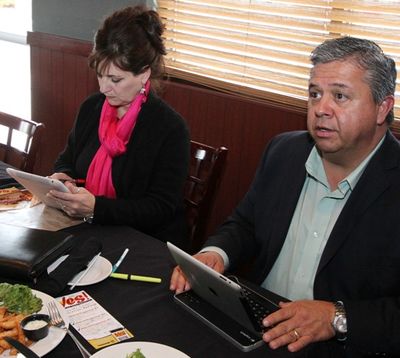 Say what you will about the laws that he pushed through the 2011 Legislature, you still have to give Superintendent Tom Luna credit for being personally plugged in online. He’s active on the social media, particularly Twitter. Here, Luna and wife, Cindy, are busy online during a break in the action at the Kootenai County Reagan Republican luncheon at Fedora this afternoon. (Duane Rasmussen photo special for Huckleberries Online)