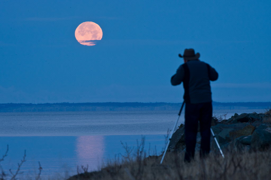 Ken Royster of Anchorage captures an image of the setting full moon from a pullout along Turnagain Arm south of Anchorage, Alaska, on Monday morning. (AP Photo/Anchorage Daily News, Marc Lester)