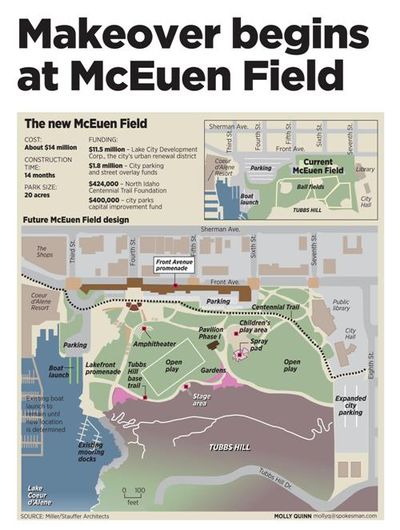 next 14 months. In the city’s most expensive park project ever, McEuen Field between downtown and Tubbs Hill will be remade to give visitors a greater variety of amenities and improve downtown’s link to the waterfront. Work begins this week and is expected to be finished by November 2013. Eighty percent of the project will be financed by urban renewal tax dollars. Major pieces of the $14.2 million makeover will be a promenade along Lake Coeur d’Alene, a grassy amphitheater, a large children’s playground and summer splash pad, and new paths, parking lots, picnic shelters and restrooms. Through private fundraising, the city may add more features, such as a fenced dog park and a skateboard park/