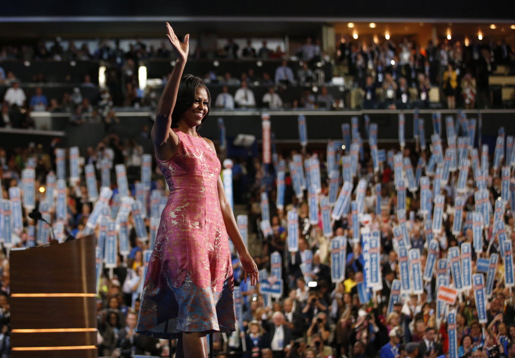 First Lady Michelle Obama waves after addressing the Democratic National Convention in Charlotte, N.C., on Monday. (AP Photo/Jae C. Hong)