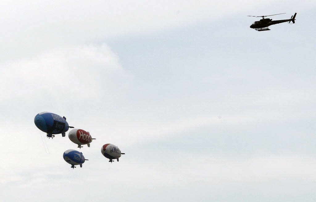 A helicopter hovers nearby as four advertising blimps, DirecTV, Hood, Horizon, and MetLife, fly together over the Hudson River near Jersey City, N.J., today. (AP Photo/Mel Evans)