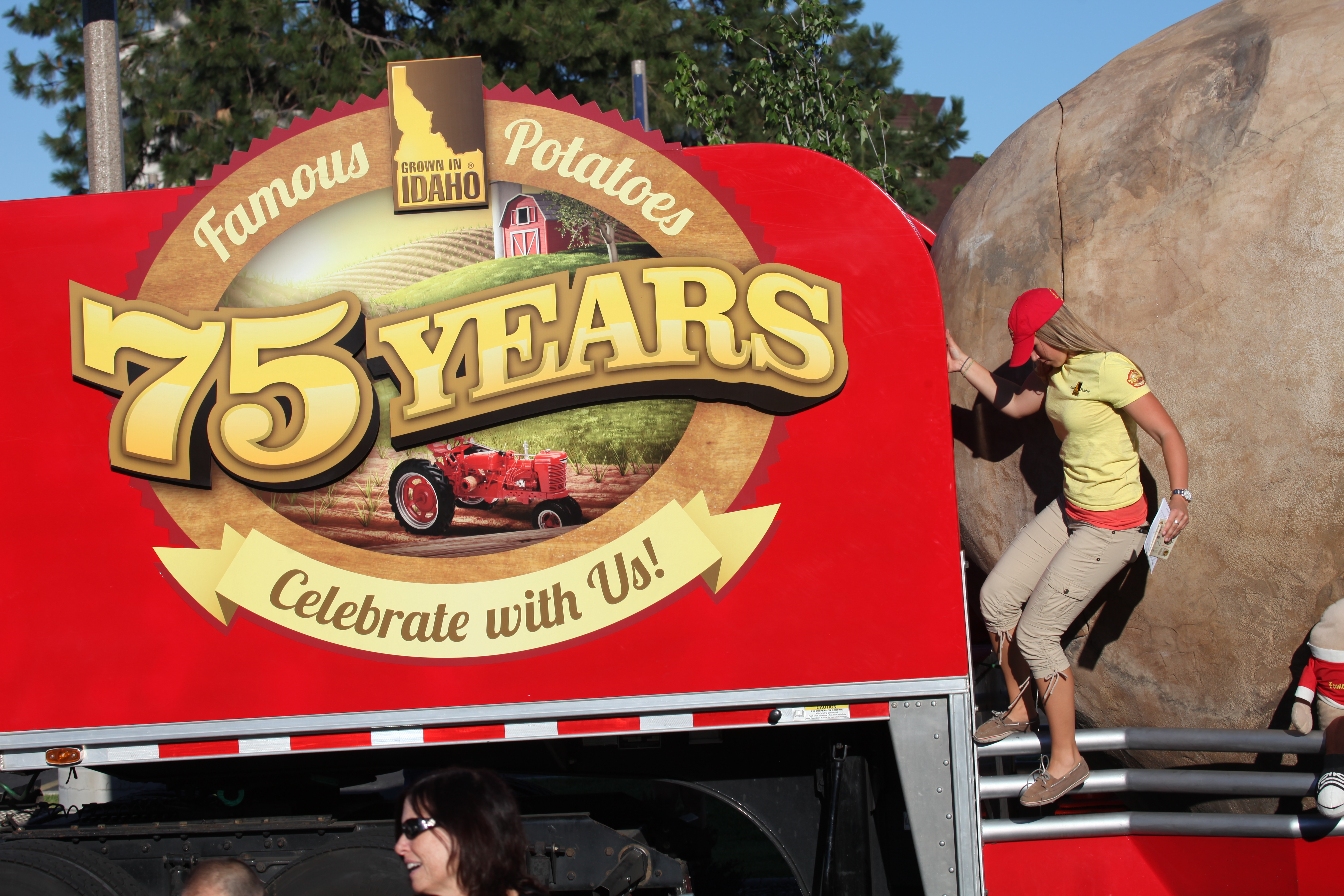 Kaiti Frickey gets off the flat bed part of the semi trailer truck that stopped at Post Falls Friday afternoon en route to Silverwood, carrying a much-traveled giant potato. She is an ambasador for the Famous Idaho Potato Tour, sponsored by the Idaho Potato Commission, which is celebrating its 75th anniversary. The vertical line on the end of the potato marks the spot where a door opens. That is where promoters keep their supplies for the trip. The giant potato was parked in front of the Post Falls City Hall Friday afternoon when Duane Rasmussen took this photograph. The potato will be at Silverwood Saturday.