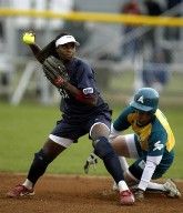 (AP file photo of a USA Softball shortstop completing a double play)