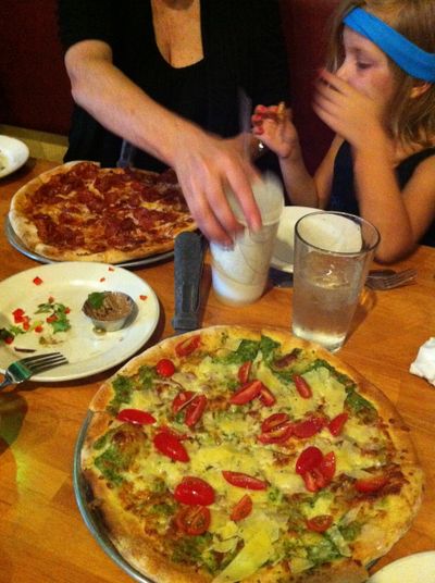 I finally got around to eating at South Perry Pizza, on a night when the crowds were thin enough to score a corner table. We bought two pies, pepperoni and margherita, and had beer and wine and lemonade for my granddaughter, Hero (she calls it “juice”).