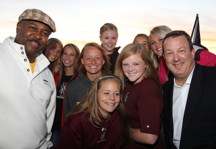 At the North Idaho College Boosters Club cruise last night, Athletic Director Al Williams, left, and Thomas Carter, executive director of the Human Rights Education Institute, pose for a photo with Cardinal softball players. (Duane Rasmussen photo special for Huckleberries)